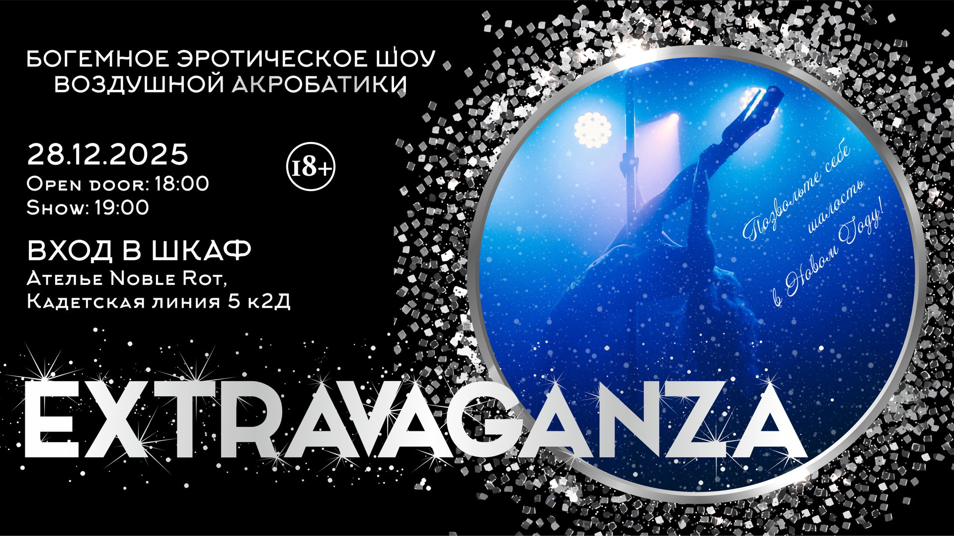 Extravaganza — это синтез высокой эротики, визуального перфекционизма и театра танца. Burlesque с пилоном это не просто жанр, а искусство. Новогодний перфоманс на стыке притчи, готической эстетики и провокации.